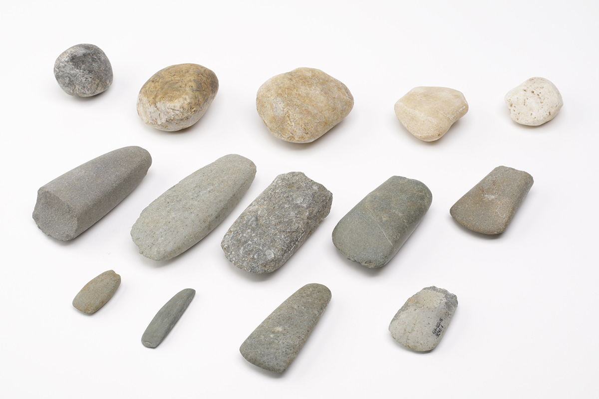 鶴ヶ居貝塚出土の磨製石斧と多面体石器