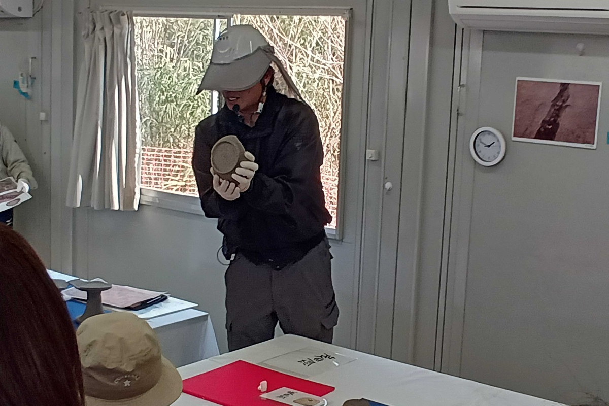 - 出土遺物を解説する調査員